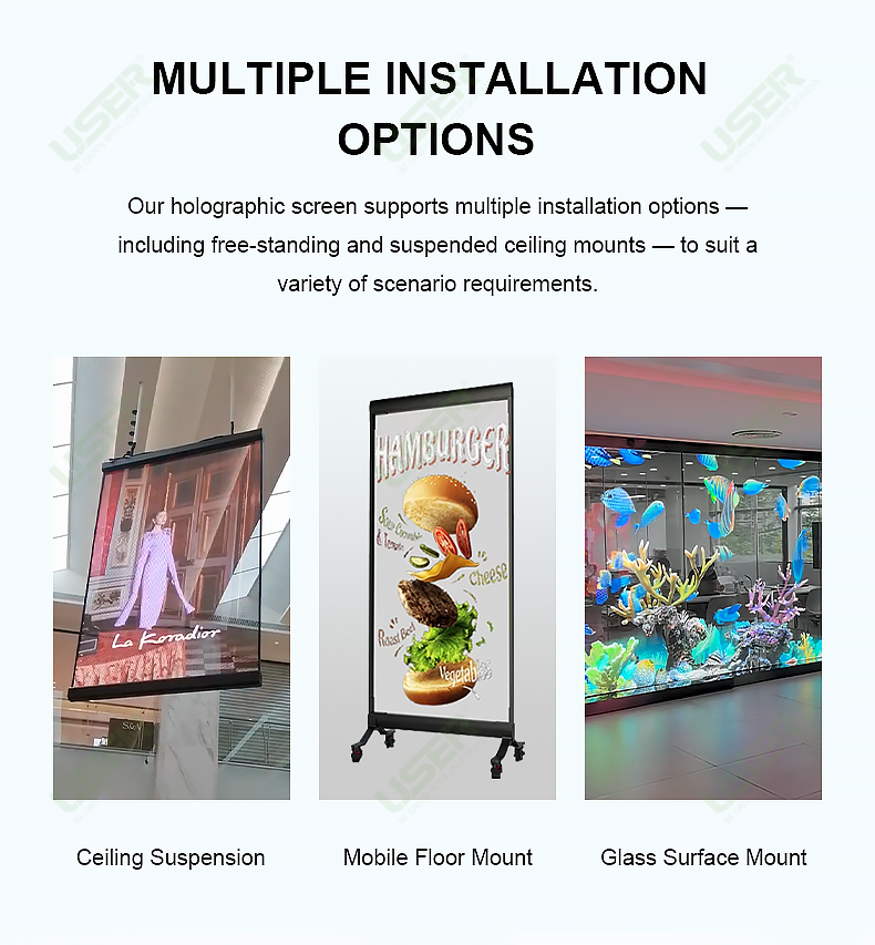 Our holographic screen supports multiple installation options -including free-standing and suspended ceiling mounts – to suit avariety of scenario requirements.